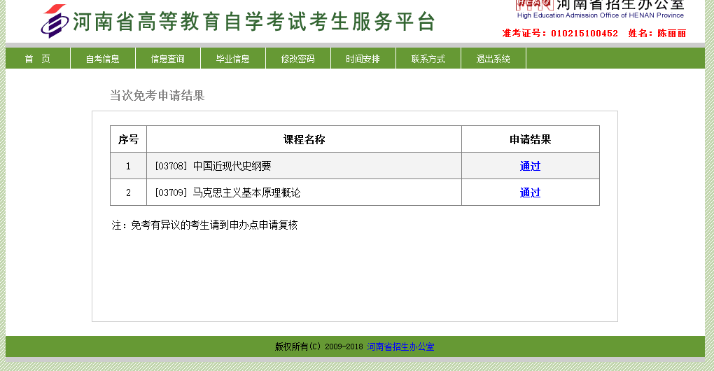 河南省高等教育自学考试考生服务平台查询结果(免考课程通过或驳回) |
